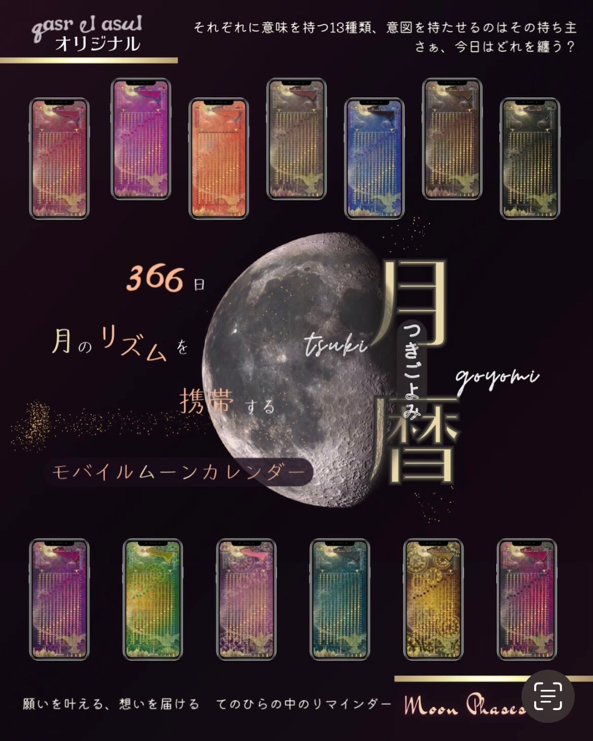 月の満ち欠けを1枚にデザインした